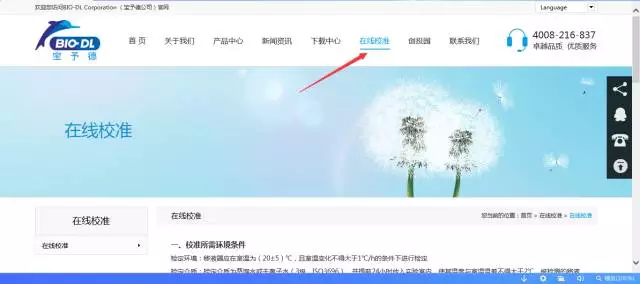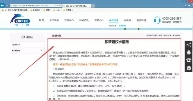 2.點擊下圖紅色箭頭指示的“在線校準”進入移液器在線校準服務。