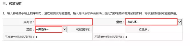 5.以下界面填入移液器手柄上的序列號,選擇量程和測試時的溫度。輸入完畢后軟件會自動出現此支移液器所需測試的體積,將移液器調到對應的體積數值。