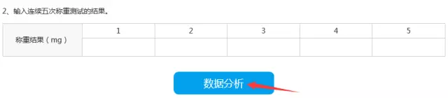 6.根據移液器校準指南操作,讀取天平讀數,輸入下示表格,并點擊藍色按鈕“數據分析”。
