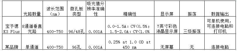 另外,我們用數據說話,對比某著名品牌同類型酶標儀,各水平參數如下: